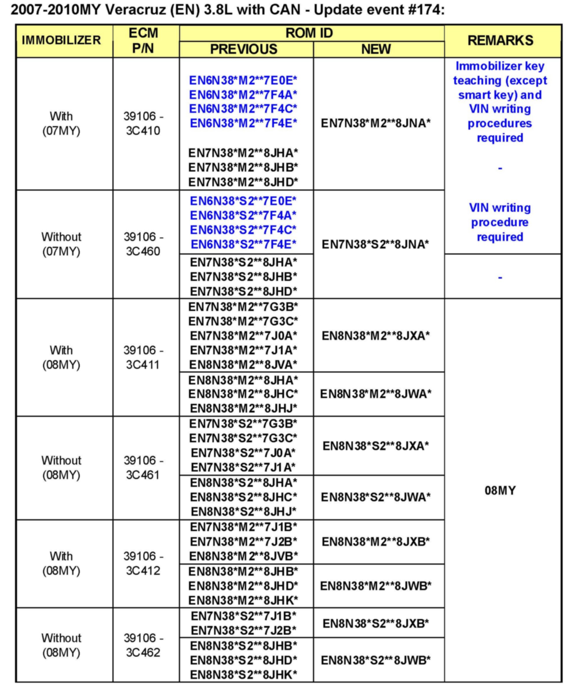 To verify the vehicle is affected, be sure to check the version of the vehicle's engine control unit ROM ID with reference to the ROM ID Information Table's above before attempting to update the control unit software.