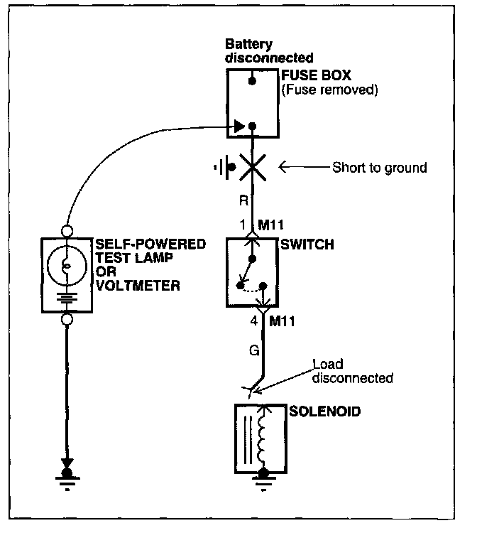 e. When the self-powered test lamp glows, or ohmmeter registers, there is a short to a ground in the wiring near that point.