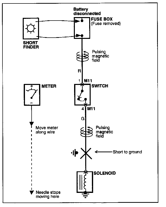 A short finder is available to locate a short to ground. The short finder creates a pulsing magnetic field in the shorted circuit and shows you the location of the short through body trim or sheet metal.