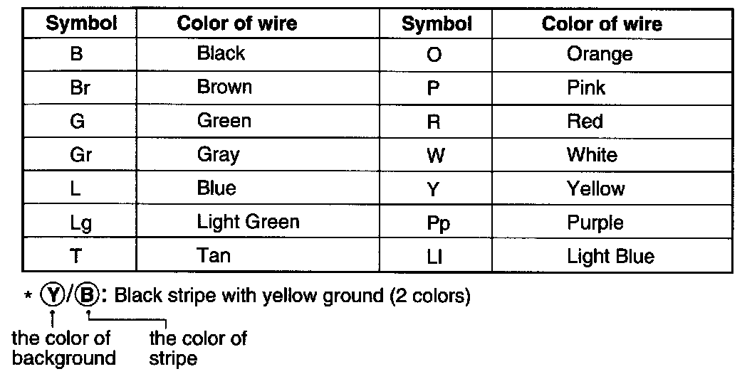 The following abbreviations are used to identify wire colors in the circuit schematics.