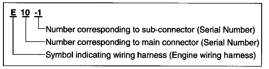 A connector identification symbol consists of a wiring harness location classification symbol corresponding to a wiring harness location and number corresponding to the connector.