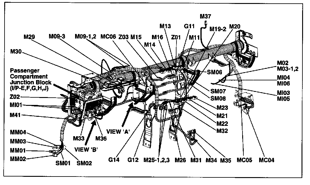 A junction block identification symbol consists of a wiring harness location classification symbol corresponding to a wiring harness location and number corresponding to the connector in the junction block.