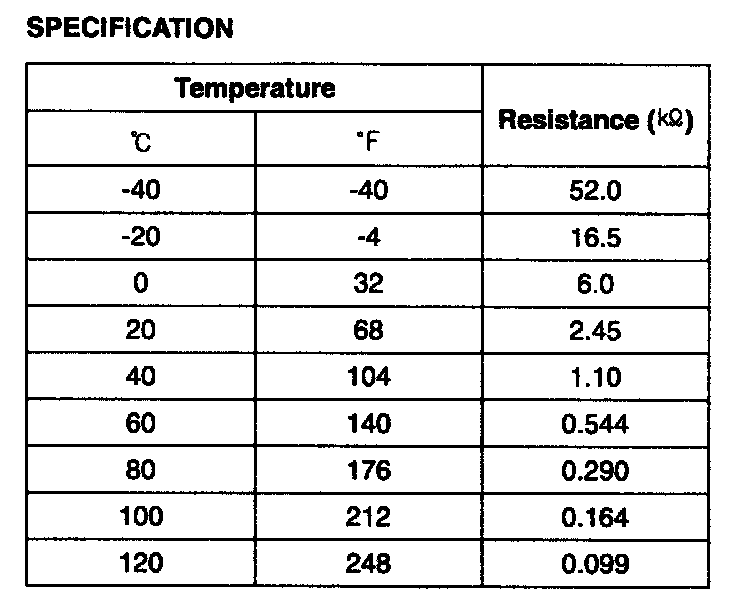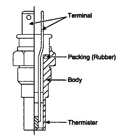 4. After immersing the thermistor of the sensor into water (or engine coolant), measure resistance between OTS terminals 1 and 2.