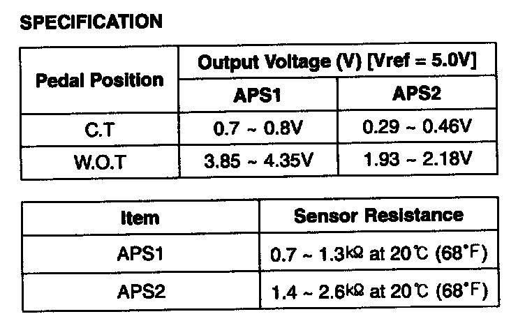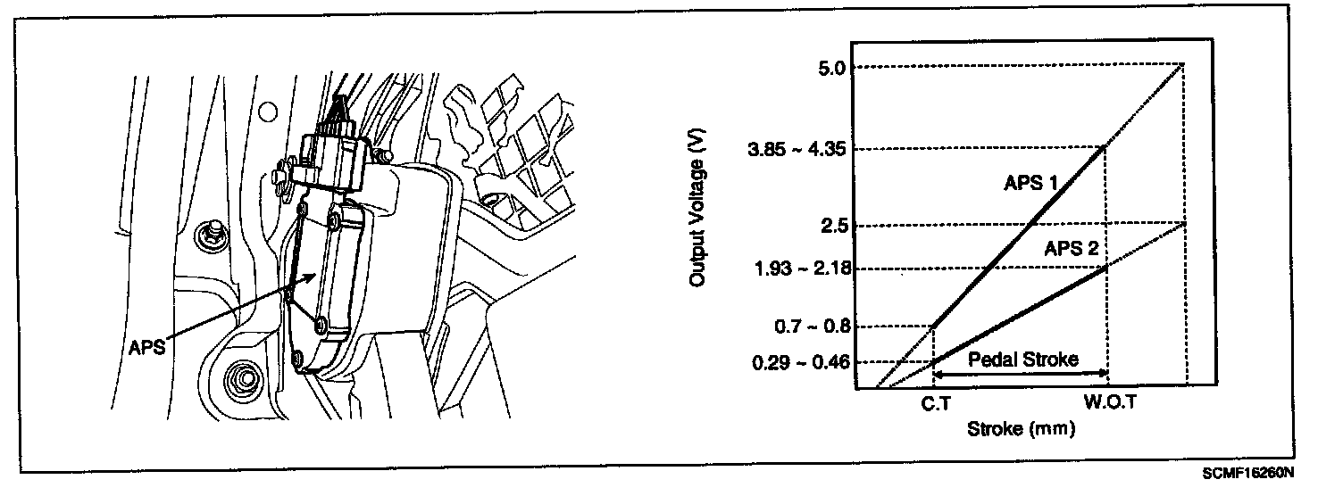 Accelerator Position Sensor (APS) is installed on the accelerator pedal module and detects the rotation angle of the accelerator pedal. The APS is one of the most important sensors in engine control system, so it consists of the two sensors which adapt individual sensor power and ground line. The second sensor monitors the first sensor and its output voltage is half of the first one. If the ratio of the sensor 1 and 2 is out of the range (approximately 1/2), the diagnostic system judges that a malfunction has occurred.
