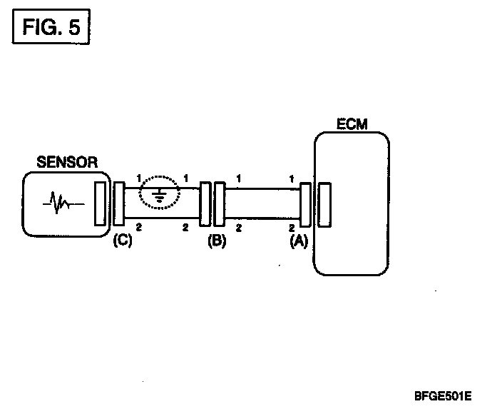 a. With each connector still connected, measure the voltage between the chassis ground and terminal 1 of each connectors (A), (B) and (C) as shown in [FIG. 4].