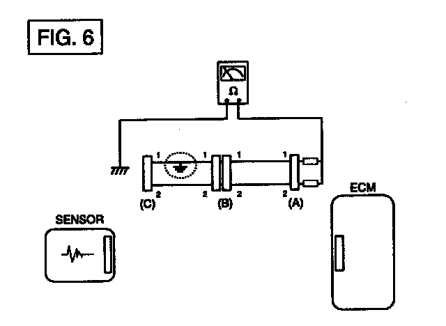 a. Disconnect connectors (A), (C) and measure for resistance between connector (A) and Chassis Ground as shown in (FIG. 6]. The measured resistance of line 1 and 2 in this example is below 1 ohm and higher than 1 Mohm respectively. Specifically the short to ground circuit is line 1 (Line 2 is normal). To find exact broken point, check the sub line of line 1 as described in the following step.