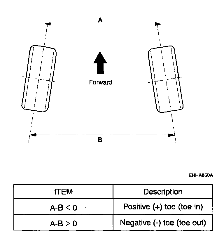When the wheels are turned in toward the front of the vehicle, toe is positive (+) (toe in). When the wheels are turned out toward the front of the vehicle, toe is negative (-) (toe out). Toe is measured in degrees, from side to side, and totaled.