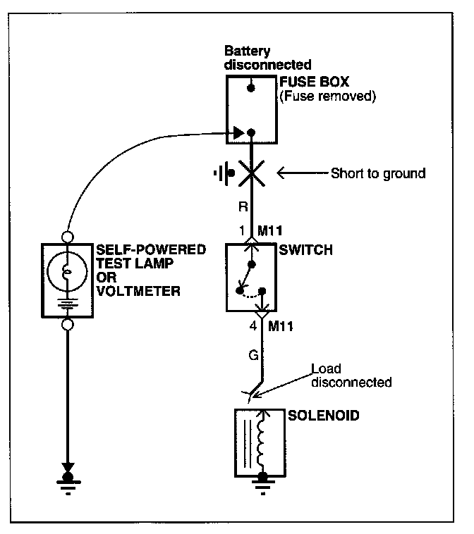 e. When the self-powered test lamp glows, or ohmmeter registers, there is a short to a ground in the wiring near that point.