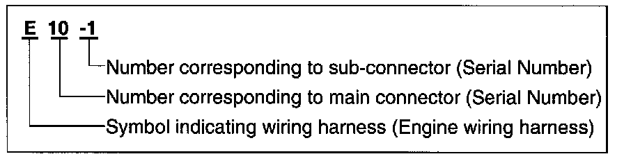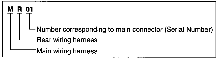 A connector identification symbol consists of a wiring harness location classification symbol corresponding to a wiring harness location and number corresponding to the connector.