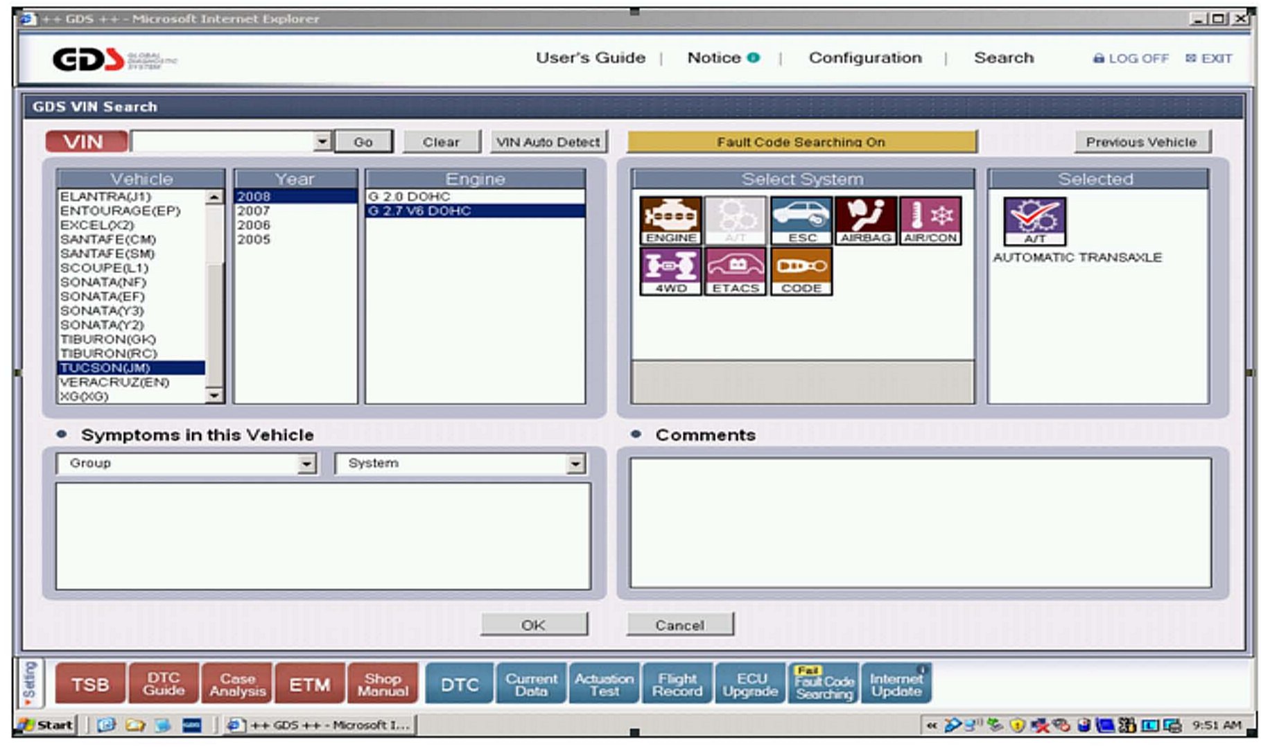 1. Enter the vehicle information manually by entering the vehicle, model year, and select AT. Select OK.