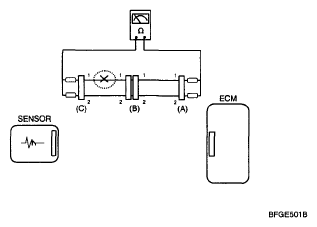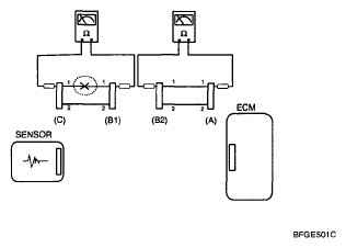 In this case the measured resistance between connector (C) and (B1) is higher than 1MΩ and the open circuit is between terminal 1 of connector (C) and terminal 1 of connector (B1).