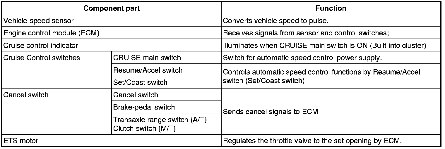 The main components of cruise control system are mode control switches, transaxle range switch, brake switch, vehicle speed sensor, ECM and ETS motor that connect throttle body.
