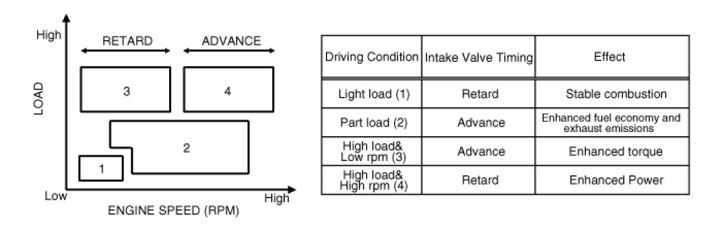 The intake valve timing is optimized by CVVT system depending on engine rpm.