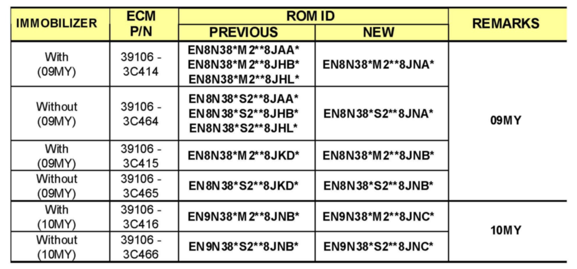 To verify the vehicle is affected, be sure to check the version of the vehicle's engine control unit ROM ID with reference to the ROM ID Information Table's above before attempting to update the control unit software.