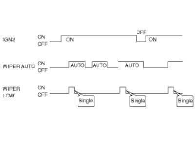 (3) A single wipe will be performed whenever rain has been detected (Rain Detected signal from Rain sensor) and the wiper switch is moved to the AUTO position. But a single wipe will not be performed when the wiper switch is moved to the AUTO position and OFF signal is being received from Rain sensor. But if the wiper switch is moved to AUTO position for the first time since vehicle ignition switch is turned on then a single wipe will be performed regardless of Rain Detected or OFF signal.