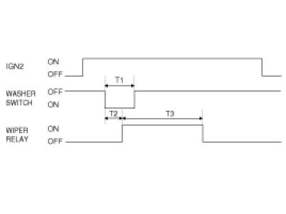 (2) Under IGN2 SW ON, WIPER RELAY is turned ON after T2 from WASHER SW ON if WASHER SW is ON for at least T1, and WIPER RELAY is turned OFF after T3 from the moment that WASHER SW is turned OFF.