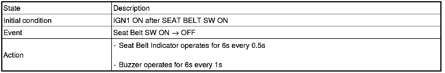 1. From IGN1 SW ON, SEAT BELT WARNING LAMP lights for 6s every 0.5s and CHIME BUZZER sounds for 6s every 1s (in case of SEAT BELT unfastened state)