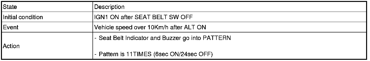 3. IF vehicle speed over 10Km/h, SEAT BELT WARNING LAMP and CHIME BUZZER are Work for PATTERN 1TIME when SEAT BELT unfastened after IGN ON/ALT"L"ON.