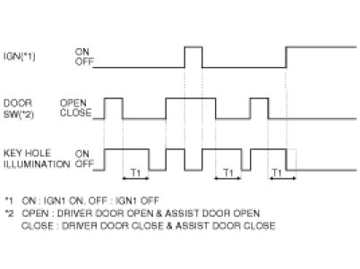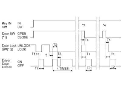 *3 UNLOCK signal is output (only once) within 1s if DOOR is closed within 0.5s from DOOR LOCK SW(DRIVER or ASSIST) UNLOCK -> LOCK under KEY IN SW IN.