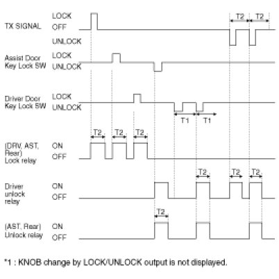 1. All DOOR UNLOCK(DR, AS, RR) signals are output for T2 if DRIVER DOOR KEY UNLOCK SW is turned ON within T1 after changing DR DOOR KEY UNLOCK SW from OFF to ON (mechanically,DRIVER DOOR LOCK SW is unlocked and BCM signal is not output).All DOOR UNLOCK (DR,AS,RR) signals are output even within T1 after TUNLOCK signal is received.)