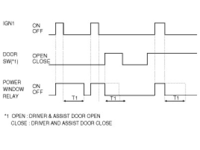 3. P/WINDOW RELAY is immediately turned OFF if DOOR is opened under P/WINDOW RELAY ON for T1.
