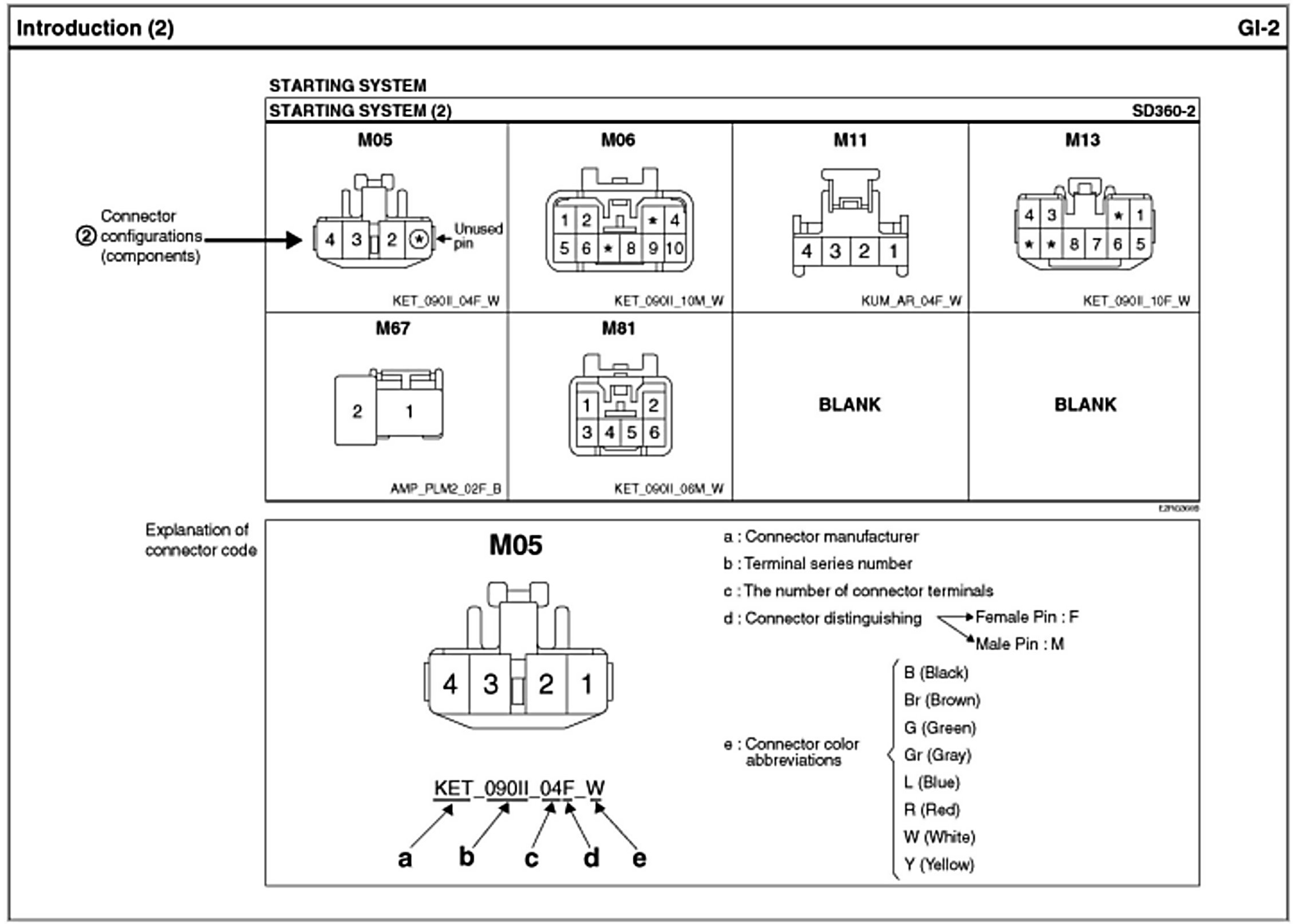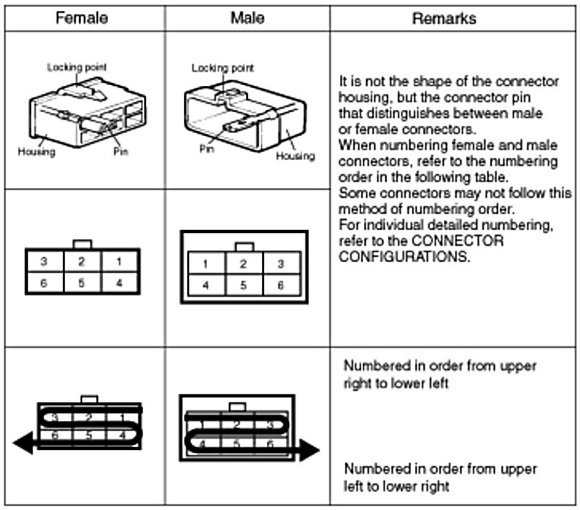 - It shows the front of the connector on the harness side when not to the harness connector. The terminal number on each connector can be obtained by following the pattern used in (5) connector view and numbering order. Unused terminals are marked with an asterisk (*).