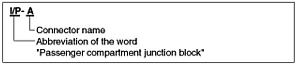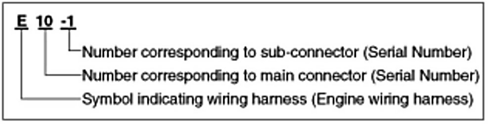 A connector identification symbol consists of a wiring harness location classification symbol corresponding to a wiring harness location and number corresponding to the connector.