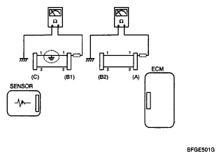 - Disconnect connector (B), and measure for resistance between connector (C) and (B1) and between (B2) and (A) as shown in Fig 3.