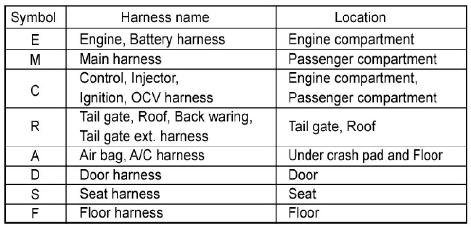 It depends on vehicles, it is necessary to check the harness name symbol on the harness layouts for detailed symbol.