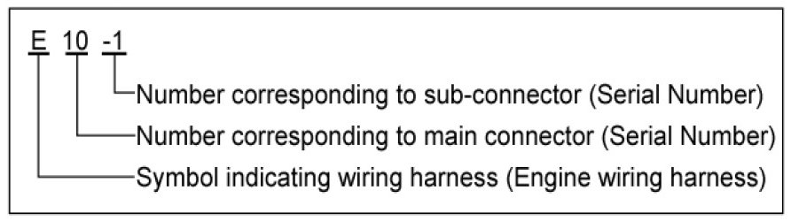 A Connector identification symbol consists of a wiring harness location classification symbol corresponding to a wiring harness location and number corresponding to the connector.
