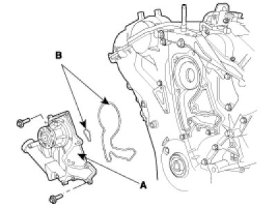 Install the water pump(A) and a new gasket(B) with 12 bolts.