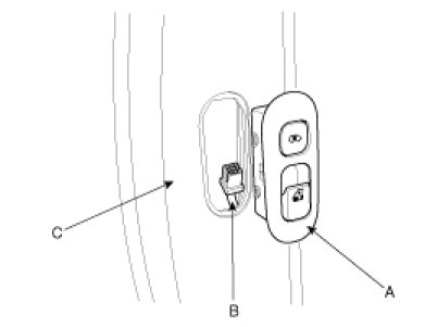 2. Disconnect the connector (B) after removing the sliding power window switch (A) from the B pillar trim (C).