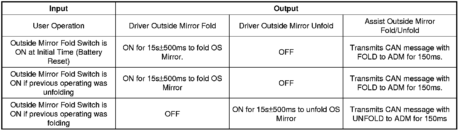 DDM controls the operating condition (Enable or Disable) of the Outside Mirror Folding as follows. Outside Mirror Folding can be controlled by user under operating condition that is in ENABLE, TIMER, and TIMER EXTEND.