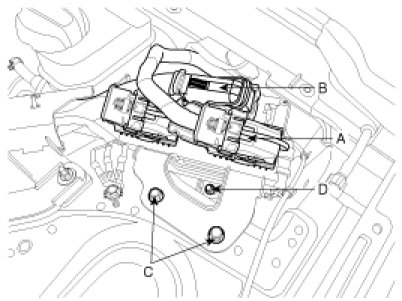4. Remove the ECM & TCM bracket installation bolts (C) and nut (D).