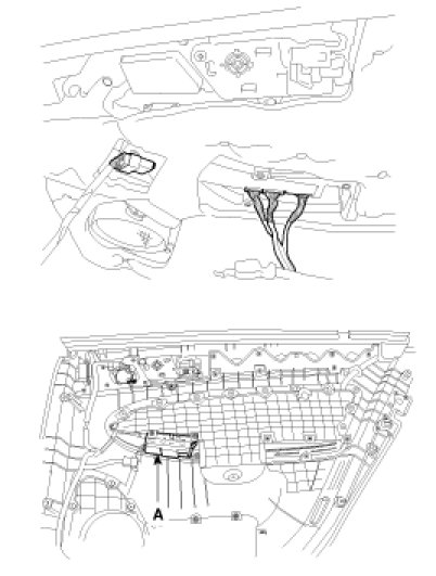 3. Remove the door module (DDM) (A) from the front door trim panel after disconnecting module connector.