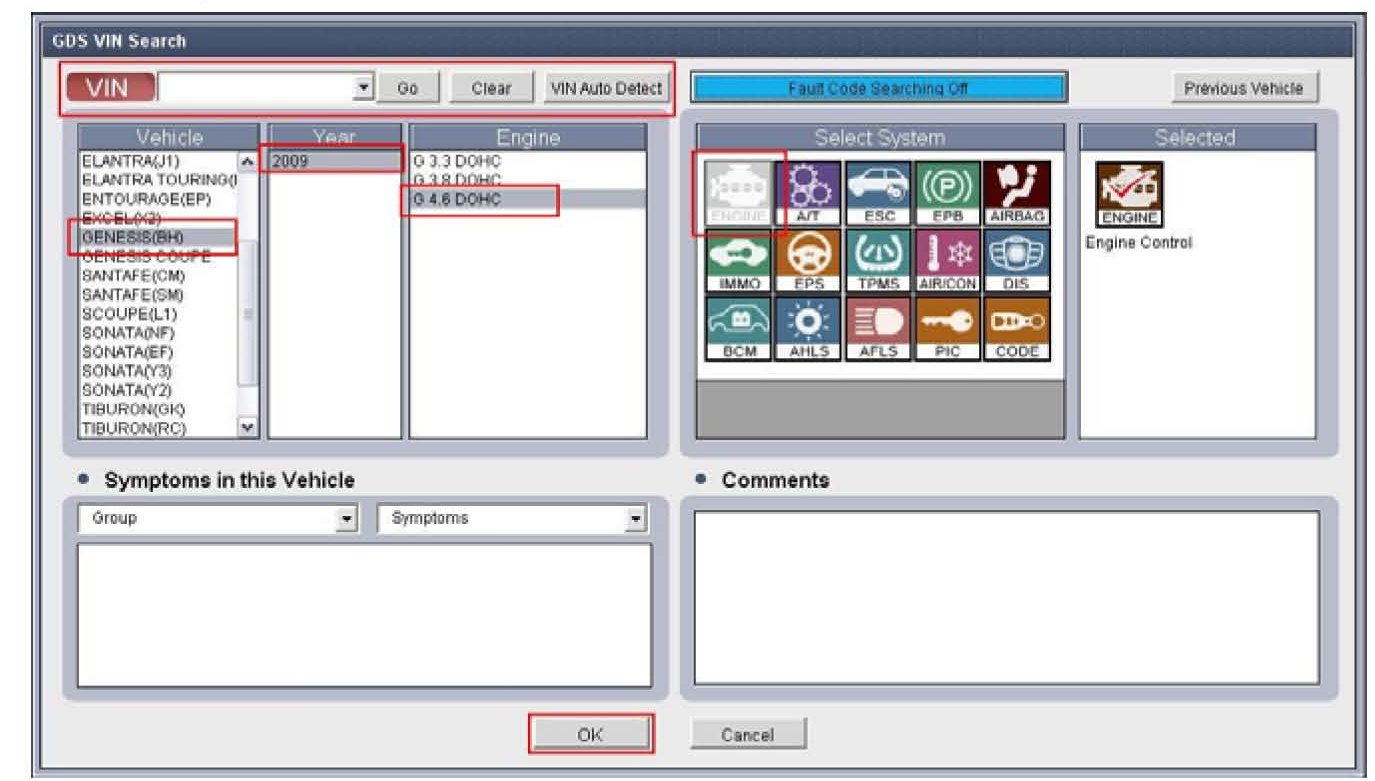 2. Enter the vehicle information by pressing the VIN Auto Detect button, entering the vehicle's VIN or selecting the vehicle model, model year, engine/fuel type and ENGINE as the system and then click OK.