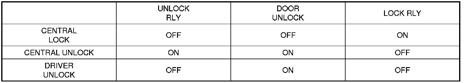 (6) The CENTRAL DOOR LOCK function is not performed during the CRASH UNLOCK output or after it. But, after the IGN is OFF, if the crash unlock function is reset, the CENTRAL DOOR LOCK function is normally performed.