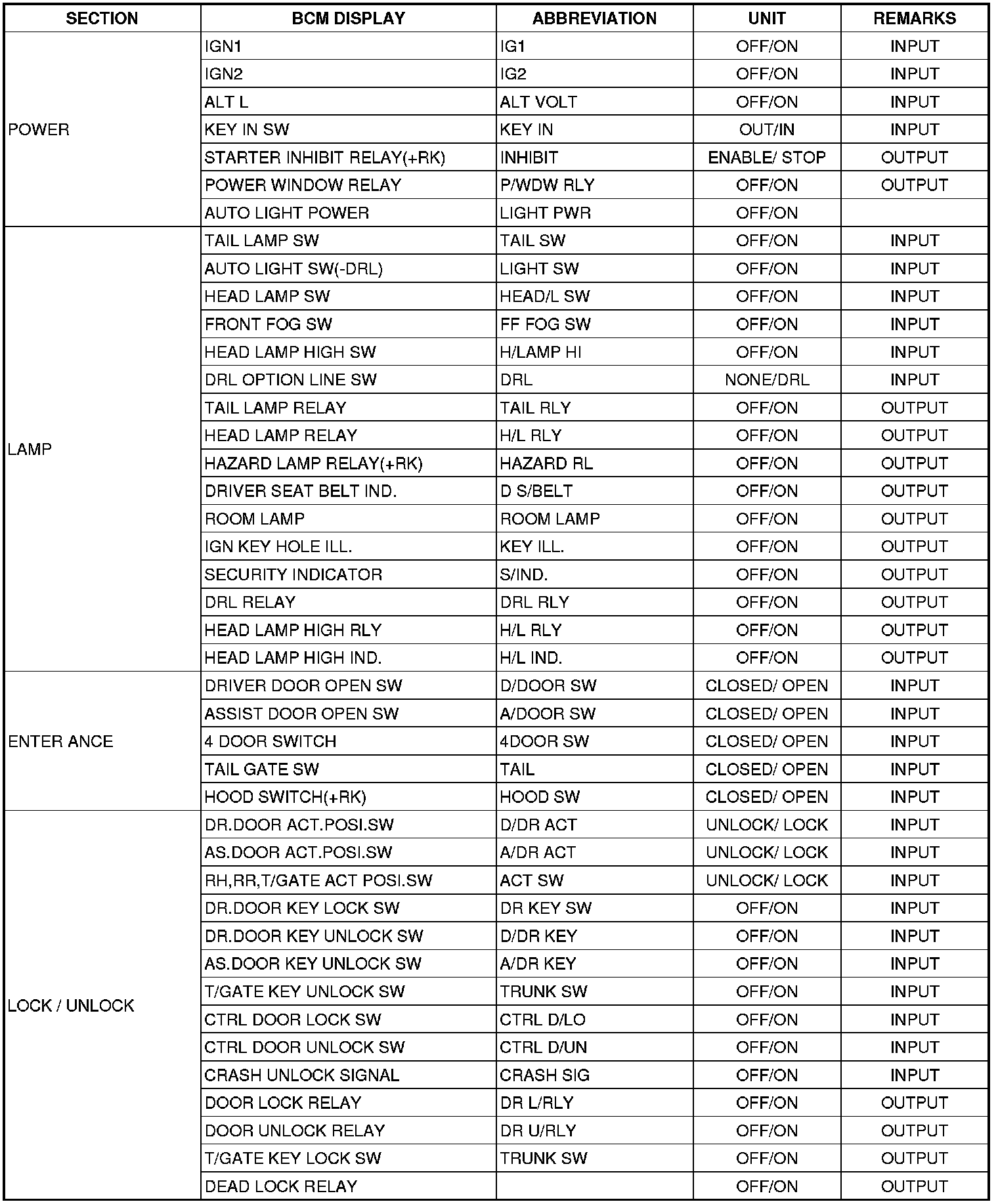 The BCM offers 3 items user option mode for a user convenience (AUTO DOOR LOCK, ARM/DISARM BY KEY, HORN ANSWER BACK)