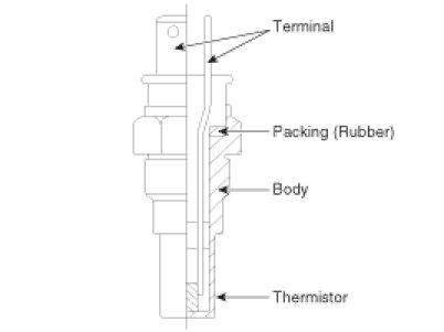 Engine Coolant Temperature Sensor (ECTS) is located in the engine coolant passage of the cylinder head for detecting the engine coolant temperature.The ECTS uses a thermistor whose resistance changes with the temperature. The electrical resistance of the ECTS decreases as the temperature increases, and increases as the temperature decreases. The reference 5 V in the ECM is supplied to the ECTS via a resistor in the ECM. That is, the resistor in the ECM and the thermistor in the ECTS are connected in series. When the resistance value of the thermistor in the ECTS changes according to the engine coolant temperature, the output voltage also changes.