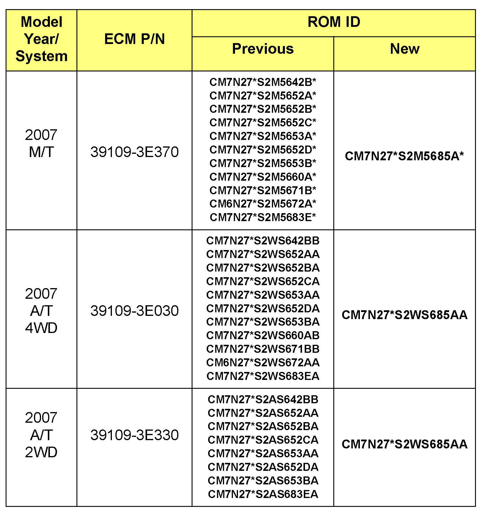 Refer to the following tables for Santa Fe and Genesis as to applicable ROM-IDs.