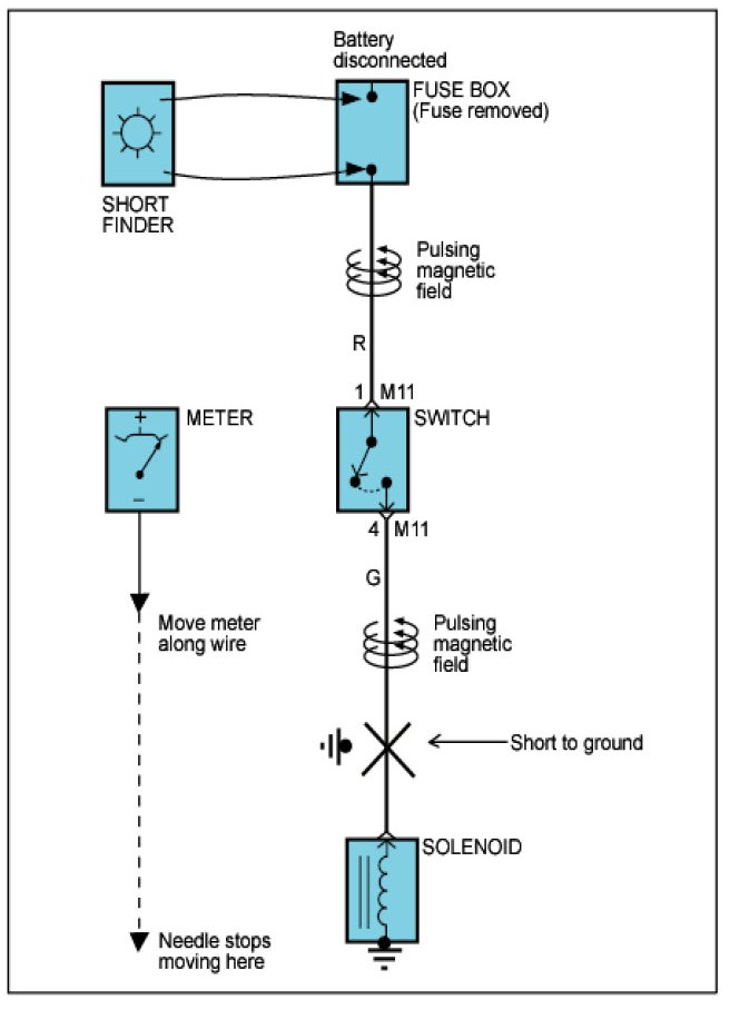 A short finder is available to locate a short to ground. The short finder created a pulsing magnetic field in the shorted circuit and shows you the location of the short trough body trim or sheet metal.