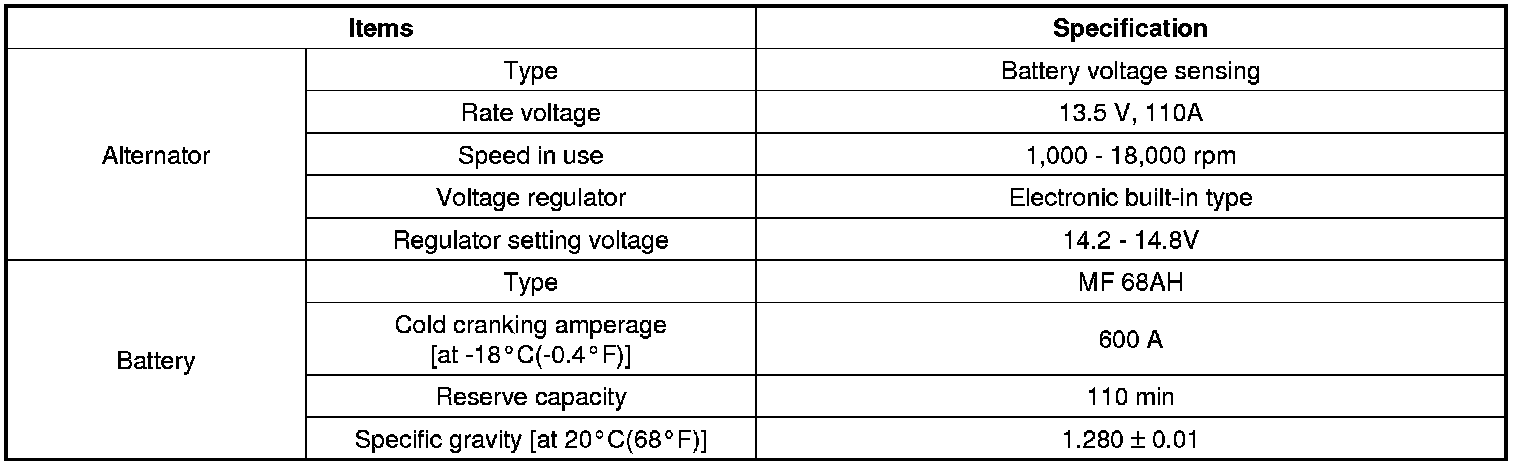 Home >> Hyundai >> 2009 >> Santa Fe AWD V6-2.7L >> Repair and Diagnosis >> Specifications >> Electrical Specifications >> Charging System >> System Specifications