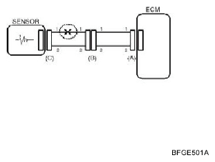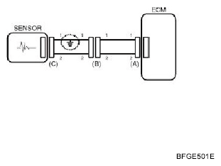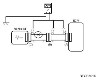 - With each connector still connected, measure the voltage between the chassis ground and terminal 1 of each connectors (A), (B) and (C) as shown in [Fig 4.