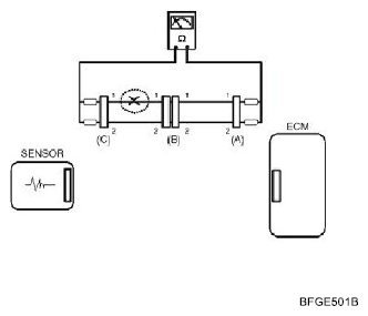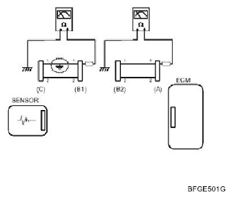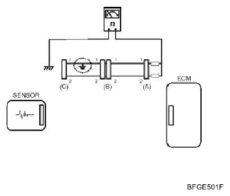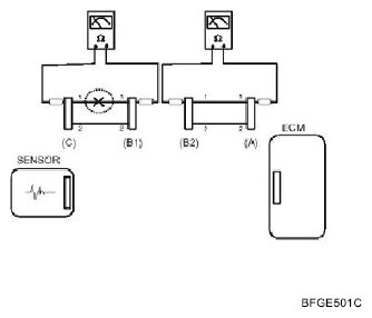 - Disconnect connector (B), and measure for resistance between connector (C) and (B1) and between (B2) and (A) as shown in [Fig 3.