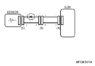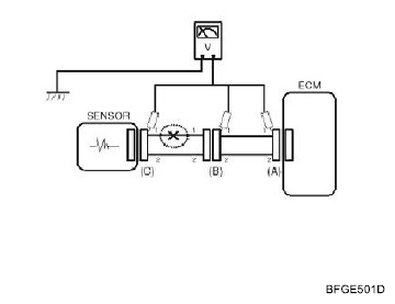 - With each connector still connected, measure the voltage between the chassis ground and terminal 1 of each connectors (A), (B) and (C) as shown in [Fig 4].