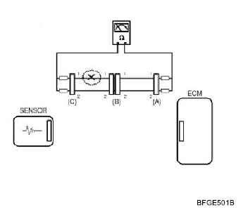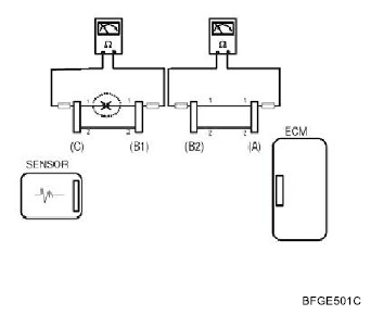 - Disconnect connector (B), and measure for resistance between connector (C) and (B1) and between (B2) and (A) as shown in [Fig 3].