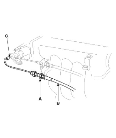 1. Loosen the locknuts(A) and disconnect the actuator cable (B) from the throttle linkage(C).