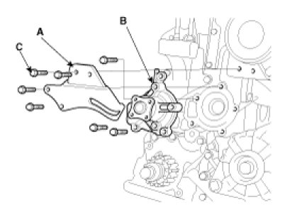 Install the water pump(B) and a new gasket with the 3 bolts.