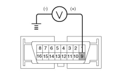 1. Measure the voltage between terminal 9 of the data link connector and body ground.