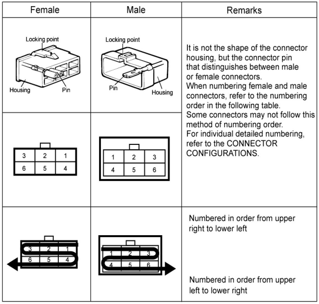 - It shows the front of the connector on the harness side when not to the harness connector. The terminal number on each connector can be obtained by following the pattern used in (5) connector view and numbering order. Unused terminals are marked with an asterisk (*).